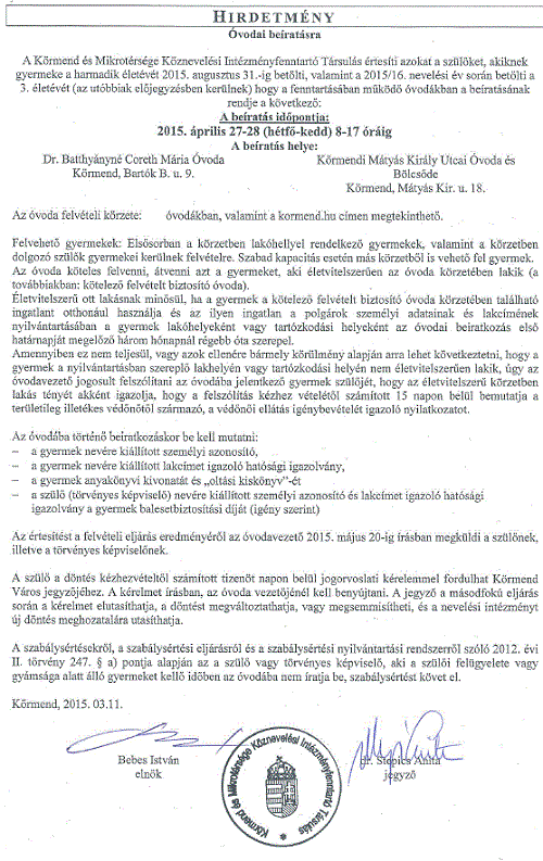 Értesítjük a leendő óvodások szüleit, hogy óvodánkban a